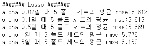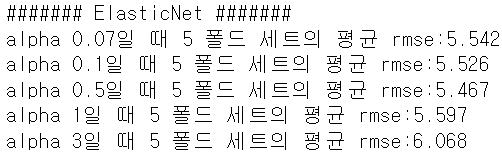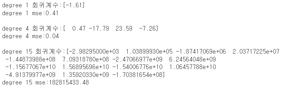 degree 15 회귀계수는 degree1, 4와 비교할 수 없을 정도로 매우 큰 값이다. degree 15라는 복잡한 다항식을 만족하기 위해 계산된 회귀계수는 결국 현실과 너무 동떨어진 예측 결과를 보여준다.