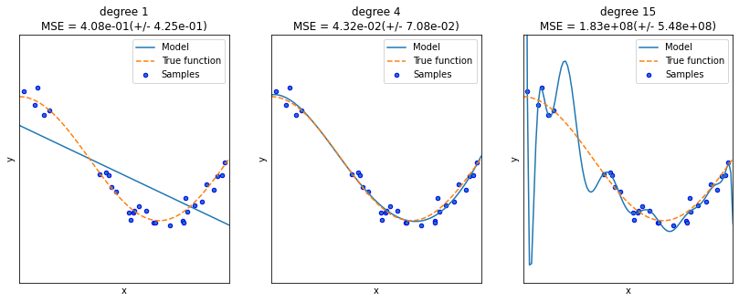 실선은 예측곡선, 점선은 실제 데이터 세트(테스트 데이터) X(X_test), y(true_func(X_test))의 코사인 곡선이다. 학습데이터는 0부터 1까지 30개의 랜덤의 X값과 그에 따른 코사인 y값에 노이즈를 추가해 구성했으며 MSE 평가는 학습 데이터를 10fold로 나누어 측정해서 평균한 것이다.