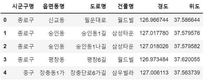 df = pd.merge(df1, df2, left_on=['법정동', '도로명', '아파트'], right_on=['읍면동명', '도로명', '건물명'])