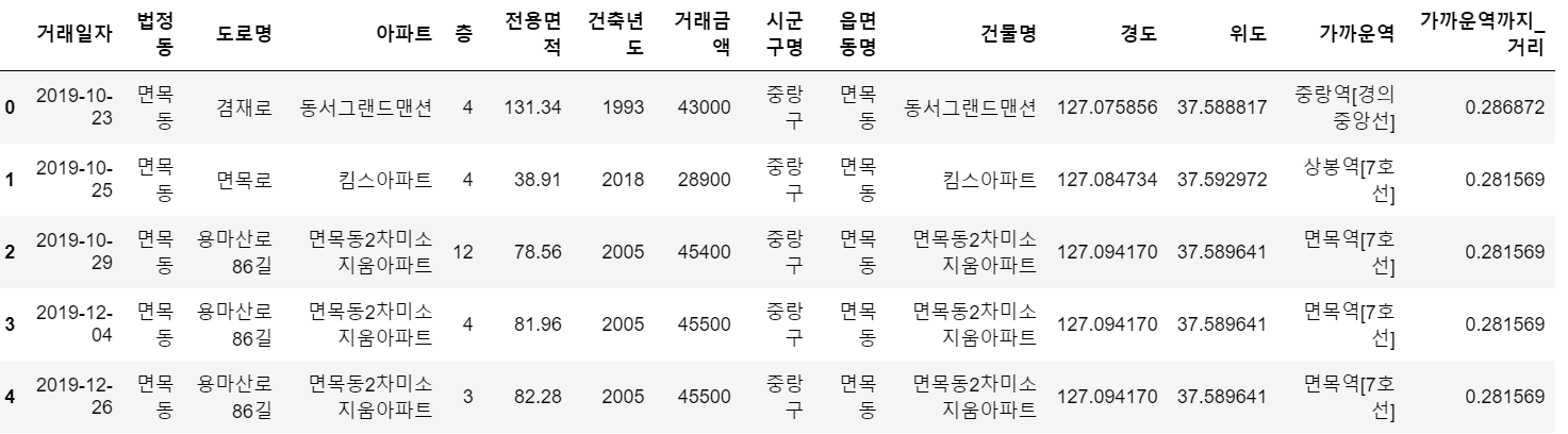 지금부터는 아파트의 위치로부터 가장 가까운 지하철역과 그 거리를 구해서 데이터프레임을 합치는 작업을 할 것이다.