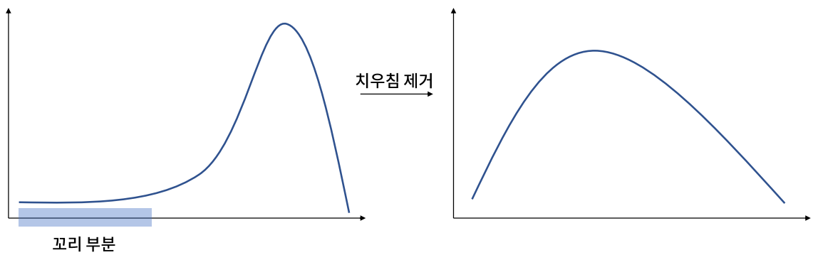 한 쪽으로 치우친 변수에서 치우친 반대 방향의 값(꼬리 부분)들이 이상치처럼 작용할 수 있으므로, 이러한 치우침을 제거해야 한다.