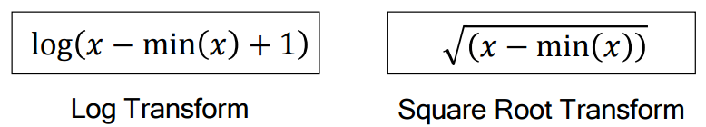변수 치우침을 해결하는 기본 아이디어는 값 간 차이를 줄이는데 있다. 대표적인 처리 방법은 다음과 같다.