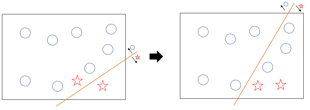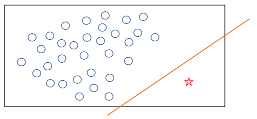 위 두 그림 모두 동그라미 데이터가 8개, 별 데이터가 2개이다. 별 데이터가 긍정 클래스라고 가정한다.