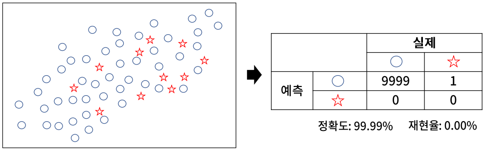 위의 그림을 통해 알 수 있듯이, 클래스 불균형 문제가 있는 모델은 정확도가 높고, 재현율이 매우 낮은 경향이 있다.