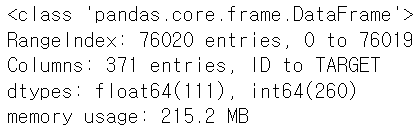 데이터 세트에서 feature는 370개로 구성되며, 클래스 레이블 명은 TARGET이다.