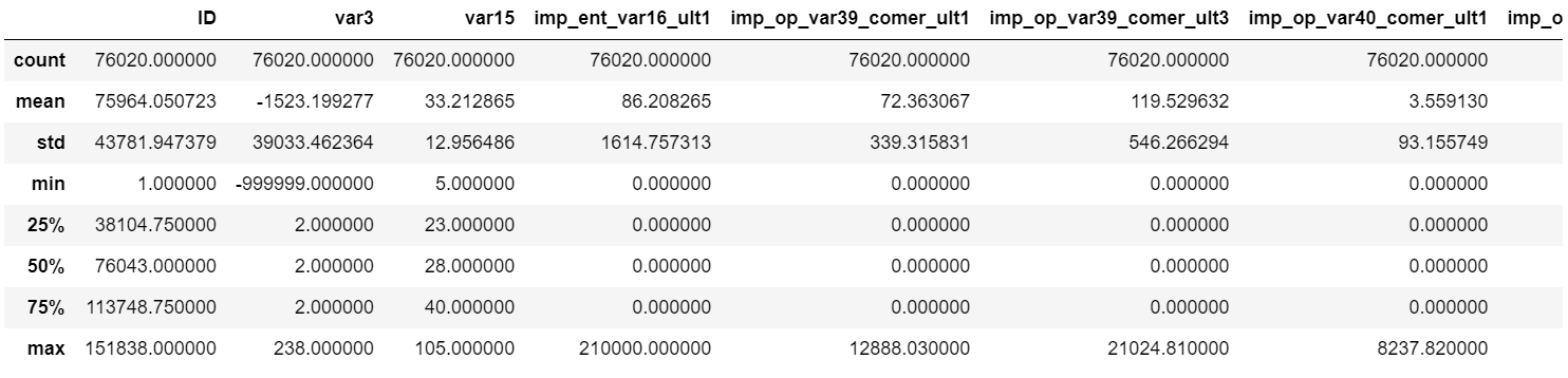 var3 컬럼의 경우 min 값이 -999999이다. 이 값은 NaN이나 특정 예외 값을 -999999로 변환한 것으로 보인다.