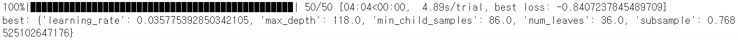 ●HyperOpt를 이용해 LightGBM의 하이퍼 파라미터 튜닝