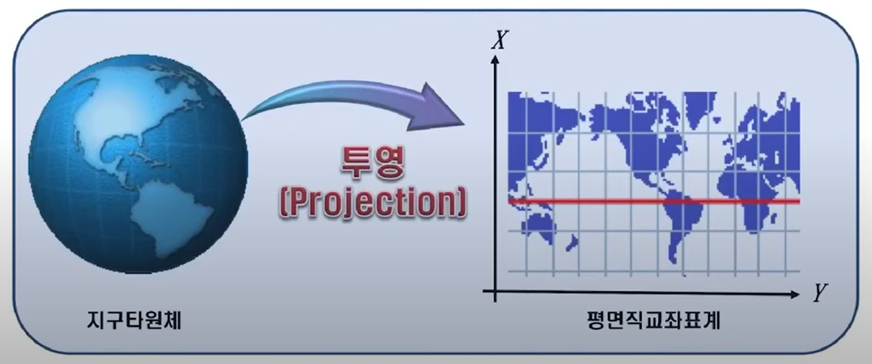- 타원체(곡면)상의 위치를 평면으로 투영한 좌표계