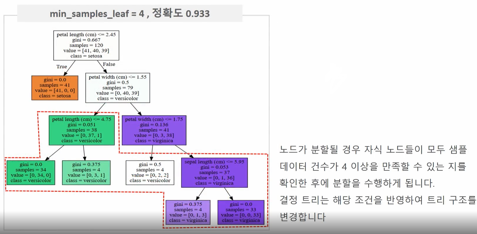 min_samples_split=4로 설정한 경우