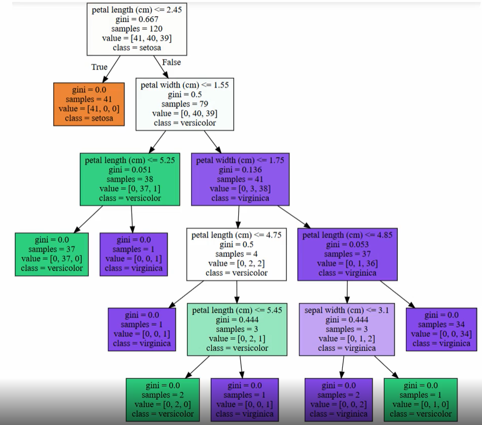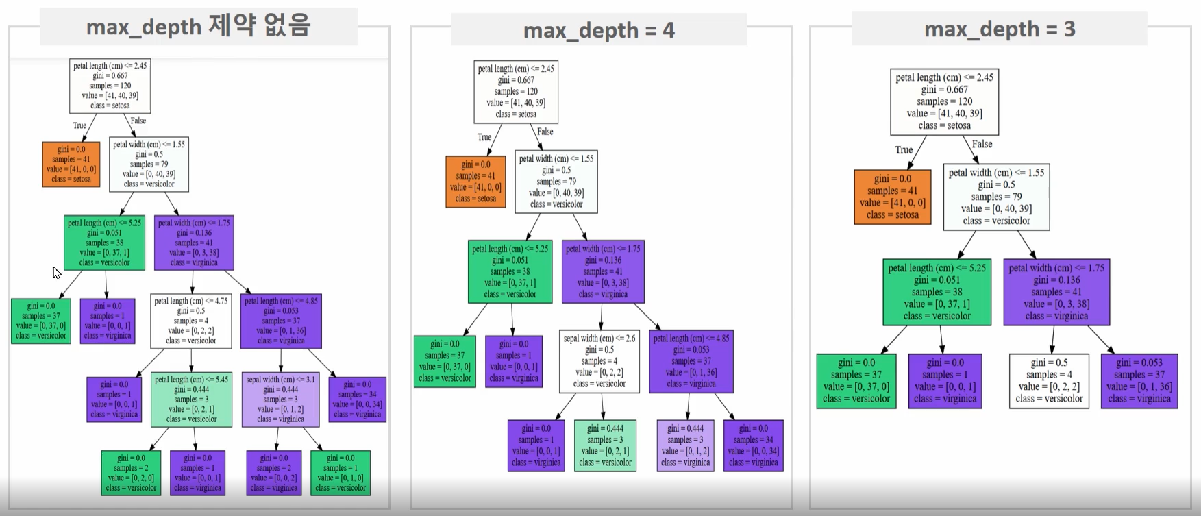 초록색 노드를 다시 살펴보면 38개의 샘플 데이터 중 Virginica가 단 1개이고, 37개가 Versicolor이지만 Versicolor와 Virginica를 구분하기 위해서 다시 자식 노드를 생성한다. 이처럼 결정 트리는 규칙 생성 로직을 미리 제어하지 않으면 완벽하게 클래스 값을 규별해내기 위해 트리 노드를 계속해서 만들어 간다. 이로 인해 결국 매우 복잡한 규칙 트리가 만들어져 모델이 쉽게 과적합되는 문제점을 가지게 된다.