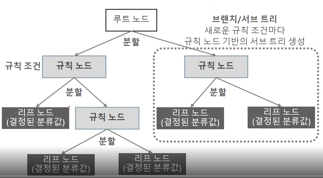 이렇듯 결정 노드는 정보 균일도가 높은 데이터 세트를 먼저 선택할 수 있도록 규칙 조건을 만든다. 즉, 정보 균일도가 높은 데이터 세트로 쪼개질 수 있도록 조건을 찾아 서브 데이터 세트로 만들고, 다시 이 서브 데이터 세트에서 균일도가 높은 자식 데이터 세트로 쪼개는 방식을 반복하는 방식으로 데이터 값을 예측하게 된다.