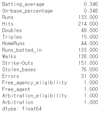 # 'Free_agency_eligibility', 'Free_agent', 'Arbitration_eligibility', 'Arbitration' 변수들은 1인걸로 보아 이진형 변수