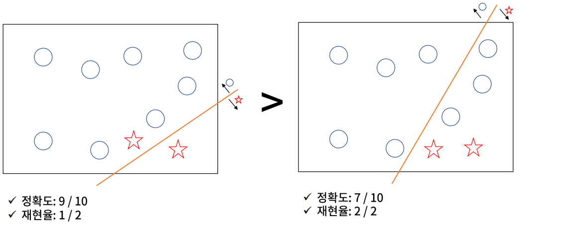 위 두 그림 모두 동그라미 데이터가 8개, 별 데이터가 2개이다. 별 데이터가 긍정 클래스라고 가정한다.